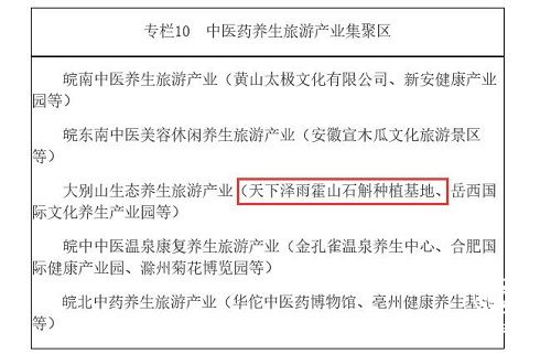 2017年,安徽省人民政府办公厅发布《安徽省“十三五”旅游业发展规划纲要》,其中“发展中医药养生旅游产业集聚区”主题板块,将天下泽雨霍山石斛种植基地纳入中医药健康养生旅游产业聚集区。