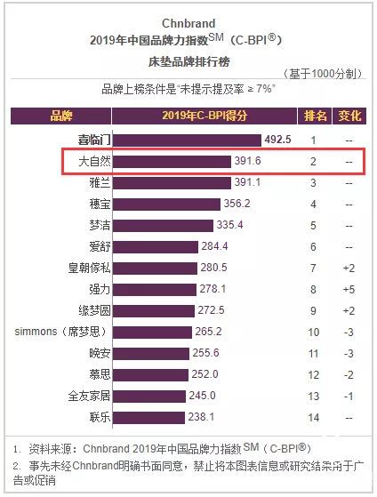 此次,荣登C-BPI中国床垫行业品牌榜第二,是消费者对大自然床垫的肯定和鼓励,更是大自然前进的动力与责任。