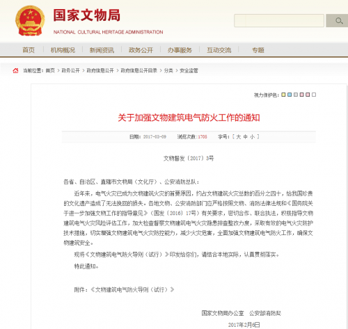 2017年2月6日,针对文物建筑电气火灾层出不穷的状况,国家文物局、公安部消防局发布了《关于加强文物建筑电气防火工作的通知》(文物督发[2017]3号),要求“采取有效的电气火灾防护技术措施,增强文物建筑防火能力。”