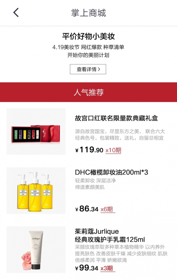 “爆款”也是此次美妆盛典一大关键词。据悉,此次活动不仅有全网难求的爆款,还有限量产品发售,加上掌上商城免息分期、5倍积分等活动,对用户来说更有吸引力。