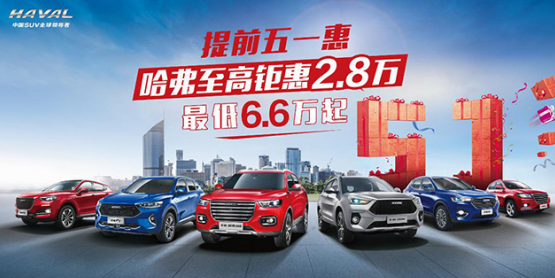 销量持续领跑的哈弗品牌并未停下前进脚步,为进一步提升品牌竞争力,感恩回馈消费者的信赖,也让更多消费者圆梦高品质SUV出行,哈弗品牌即日开启“提前五一惠哈弗神车至高钜惠2.8万最低6.6万起”的促销活动。通过大额现金优惠+大幅购置税补贴+金融贴息的方式,为消费者带来了极具诚意的综合优惠。其中,“国民神车”全新哈弗H6可享受最高16000元综合钜惠,其他时下热门车型也有7500~27000元不等的综合优惠。此次钜惠活动持续到5月末即止,对于有购车意向的消费者而言,购车良机不容错过。