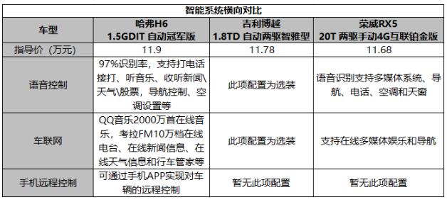 吉利博越不仅车联网系统为选装,其语音识别控制系统也是选装装置,而荣威RX5则暂无手机远程控制的配置。此外,哈弗智联3.0系统内置4G网络下载速率高达20.42Mb/s,且享受三年不限流量特惠,让人们在行车途中也能获得最佳娱乐体验。