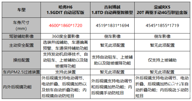 在安全性上,全新哈弗H6的铠甲安全系统是这款车的一大亮点。相比吉利博越和荣威RX5仅支持倒车影像,全新哈弗H6可提供360度全景影像,使得车辆在停车入位时极大降低事故发生率,让司机驾驶更加顺畅,也使得乘车人乘坐更加放心。全新哈弗H6在主动安全配置和操控配置上也是更胜一筹。全新哈弗H6可选装并线辅助、车道偏离预警以及车道保持辅助功能,而且在操控装置上还拥有发动机启停技术、自动驻车、上坡辅助以及陡坡缓降功能,可为消费者在行驶途中提供更加全面的呵护。同时全新哈弗H6还装配有PM2.5过滤装置,能为消费者提供更清洁干净的室内空间。此外,全新哈弗H6外后视镜还支持电动调节、电动折叠、后视镜加热以及锁车自动折叠功能,且内后视镜还自动防炫目。相对而言,吉利博越和荣威RX5的内后视镜只能手动防炫目,吉利博越的外后视镜仅支持电动调节和后视镜加热功能。