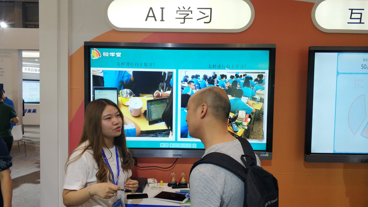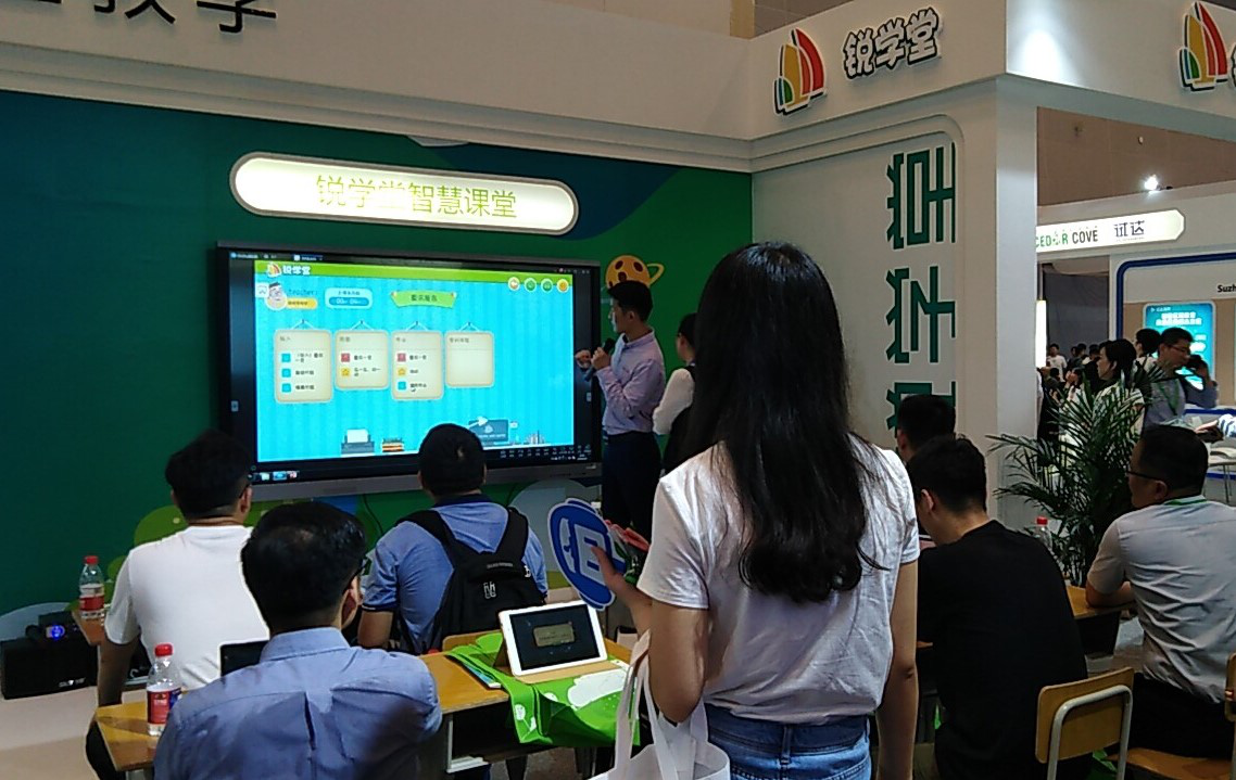 “锐学堂以智慧课堂为价值追求,以有效教学为目标,不给老师增加备课负担。”锐学堂智慧教学展区一位讲解人员告诉记者。智慧课堂核心是实现学生的深度互动,促进学生全面参与课堂,激发学生探究合作学习,同时学生能够方便获取学习资源,教师随时可以查看学生的学习情况、完成备课及进行科研工作。
