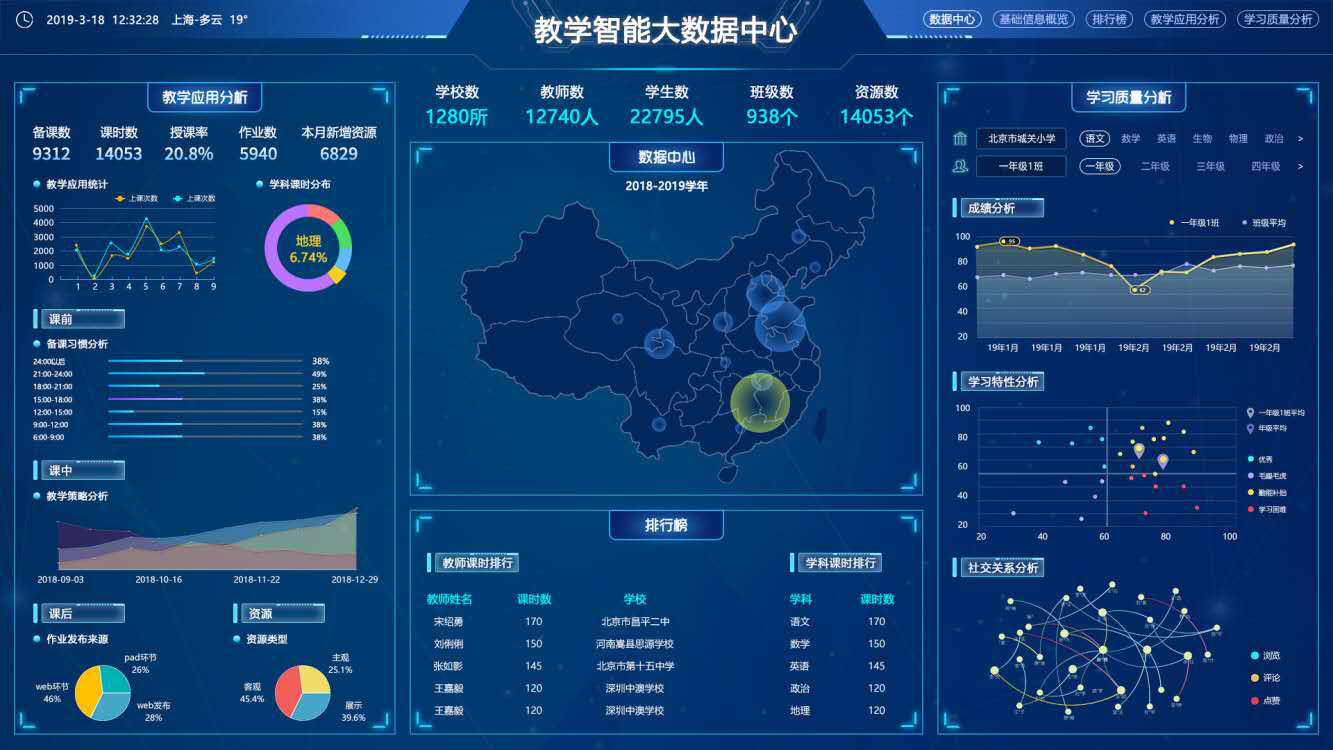 锐学堂教学智能大数据中心区域应用数据情况示意