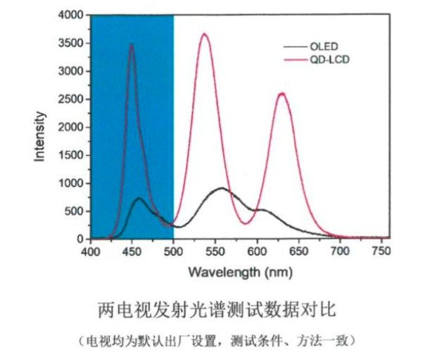 测试结果显示,在400-500nm蓝光范围内,OLED电视蓝光放射量为29923(400、500nm曲线下积分值,相对值,无单位),QD-LCD电视蓝光放射量为87140(400、500nm曲线下积分值,相对值,无单位),说明OLED电视发生蓝光损伤的风险小于量子点液晶电视