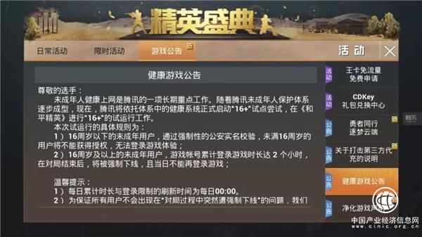 《和平精英》的另一个意义不得不提:腾讯宣布此前预告的“16+”未成年人保护措施在《和平精英》上开始试点运行。腾讯会将玩家数据交由公安部验证,并基于回传的实名校验结果对未满16周岁的玩家进行限制——只有年满16周岁的玩家才能登录游戏。同时,16岁以上的未成年玩家仍受到健康系统的管理,每天限玩2小时。
