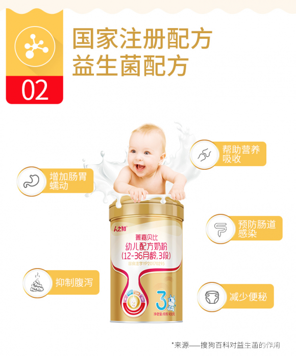 人之初菁嘉贝比配方中添加的核苷酸就符合国家标准。除此之外,还在配方中添加了进口活性益生菌、复合益生元等多重营养组合,并采用新西兰进口奶源,科学配比,全面呵护宝宝肠道健康成长。