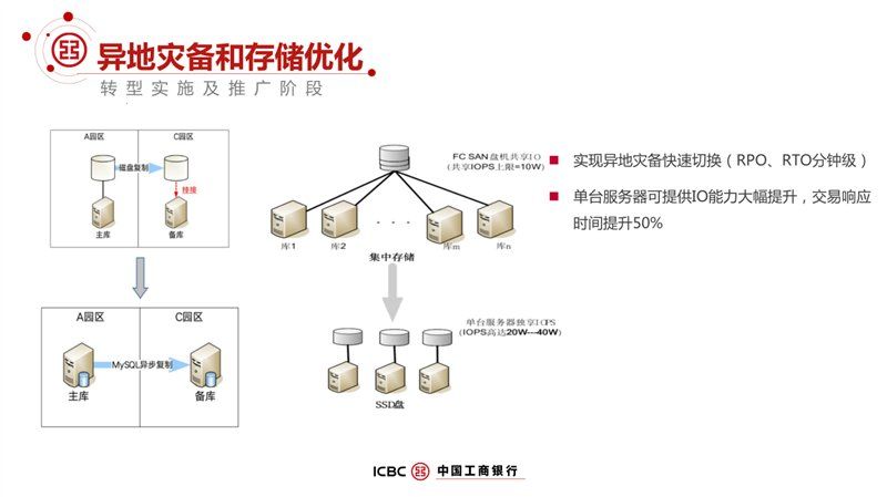 同时实施过程中我们走的比较快了,一年几百个节点,几十个应用。在这个过程中,我们又对高可用方案进行了持续的优化,同时学习和借鉴互联网包括分布式数据库的一些方案,我们把一主两备,本地1备和同城1备,扩展成1主3备,通过半同步的机制,做到真正的在系统级去保证RPO=0;
