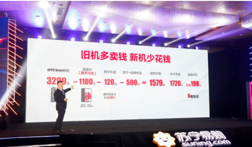 补贴包括苏宁、品牌、回收企业以及金融补贴,可以说总体额度非常大,侯总在会上还给大家具体举例了,如果你要入手OPPO的新品手机,原价三千多,但是各种补贴加上回收机的款项,最后可能只需要一千五左右就能换购新机。