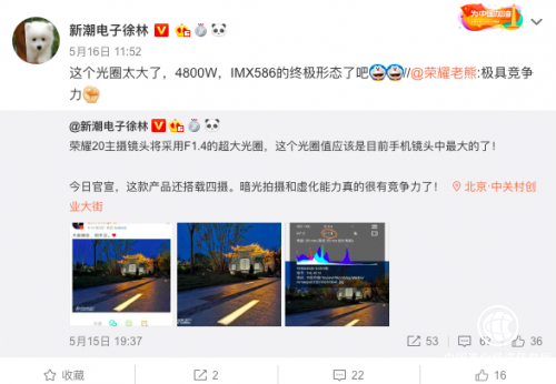 除了具备上述提到的拍照能力,近日外围更是曝出猛料,《新潮电子》主编徐林对荣耀总裁赵明分享出的荣耀20系列夜拍照片进行分析,发现其主摄像头光圈为F1.4。随后,荣耀产品副总裁熊军民@荣耀老熊转发并评论“极具竞争力”,默认猜测结果。随后徐林更是指出,业界最大光圈加持下,荣耀20系列4800万将迎来终极形态。