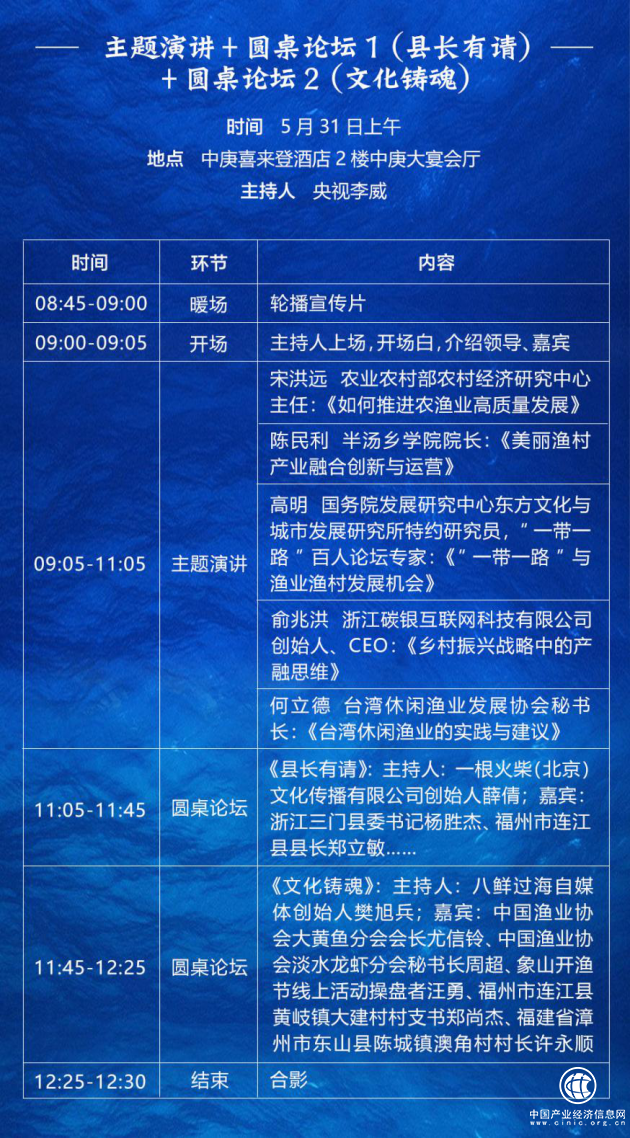 31日上午的论坛,将邀请农业农村部农村经济研究中心主任宋洪远、半汤乡学院院长陈民利、国务院发展研究中心东方文化与城市发展研究所特约研究员,“一带一路”百人论坛专家高明、台湾休闲渔业发展协会秘书长何立德、浙江碳银互联网科技有限公司创始人、CEO俞兆洪,针对渔业渔村振兴中的专门问题作精彩的主题演讲。“县长有请”圆桌论坛,将邀请渔业特色县的领导为大家分享县域渔业发展的模式和亮点。“文化铸魂”圆桌论坛将邀请中国渔业协会分会代表、渔业节庆活动操盘者、最美渔村村长等嘉宾对谈渔文化传承、渔旅融合、品牌打造等话题。