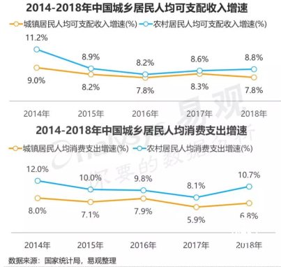 人口红利之外的另一利好信号是,新兴市场人群不断释放的消费潜力。三、四线城市相较于一二线城市,房贷、车贷压力相对较小,逐步提升的可支配收入及消费支出为其网络消费提供了重要前提。来自国家统计局数据显示,2018年,农村居民的人均可支配收入同比增速达到8.8%,超过了城镇居民的7.8%,农村居民人均消费支出同比增速10.7%,超过城镇居民的6.8%。