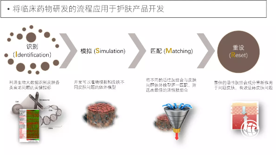 第二大核心竞争力——功效成分筛选平台。就是将临床药物研发的流程应用于护肤产品开发,针对不同皮肤衰老问题,建立集识别(Identification)、模拟(Simulation)、匹配(Matching)以及重设(Reset)为一体的I.S.M.R的流程。在此基础上与分泌型天然多肽因子库有机结合,目标导向化高效筛选创新型多肽成分组合。