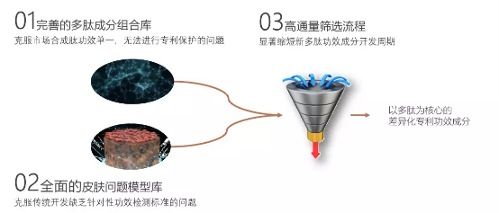 1)完善的多肽成分组合库,种类与组合化,克服市场合成肽功效单一,无法进行专利保护的问题;