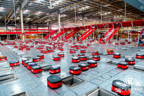 京东物流无人仓内,分拣AGV正在繁忙工作。