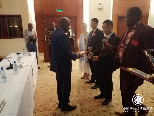 矿业部长MinistredesMinesetdelaGéologie给黄小忠会长授牌