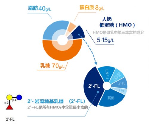 HMO(humanmilkoligosaccharides)中文翻译为“母乳低聚糖”或“母乳寡糖”,是母乳中第三丰富的固体成分(仅次于脂肪和乳糖),母乳低聚糖大概在母乳中占千分之五到千分之十二,那么母乳低聚糖的构成超过200多种,结构复杂。母乳中的母乳低聚糖含量是继乳糖、脂肪之后的第三大固体组分,比牛乳中的要高出十到上百倍,具有调节免疫,帮助大脑发育及调节肠道菌群等功能。