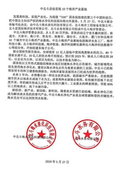中北斗副总裁黄晓辉说,为迎接中国科技日,中北斗海洋管委会决定,从6月开始,启动天津市、南通市、青岛市、厦门市、东戴河新区等首批海洋产业基地。联合国研究报告指出,全球现有12亿人面临中度到高度缺水的压力,80个国家水源不足,20亿人的饮水得不到保证。预计到2025年,缺水人口将达到28亿。中国已被列入全世界人均水资源13个贫水国家之一,海水净化已经成为解决淡水危机的替代产业。中北斗做水务科技,应用中国北斗大数据、人工智能生产和物联网远程监控的行业新技术,打造国际化、现代化、产业化、专业化的水务市场新业态,以区域授权或连锁加盟的方式,发展专业运营商管理和服务团队,建设农业、工厂、酒店、医院、校园、企事业单位和社区百姓供水产业化配套平台。以参股合作、并购兼并、转制控股、托管运营等多种方式,参与地级市水务公司和县级水厂经营管理。