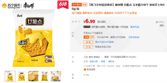 618期间,苏宁易购联合康师傅,推出了主演陈飞宇、何蓝逗推荐的观影必备小零食——康师傅甘脆点玉米脆片。消费者前往苏宁易购搜索,即可一键get。
