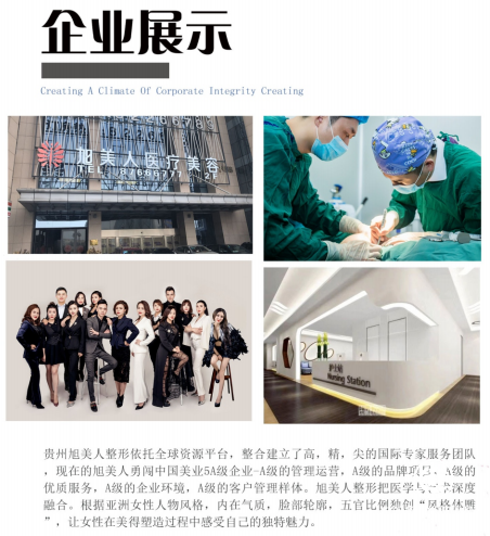 据介绍,贵州旭美人整形依托全球源平台,整合建立了高、精、尖的国际专家服务团队,现在旭美人勇闯中国美业5A级企业,A级的管理运营、A级的品牌项目,A级的优质服务,A的企业环境,A级客户管理样体。旭美人整形把医学与艺术深度融合。旭美人的使命是:创造美,传递美;美丽宣言是:你的美丽,我的使命;服务理念是:省心,耐心,放心,贴心,细心,安心。