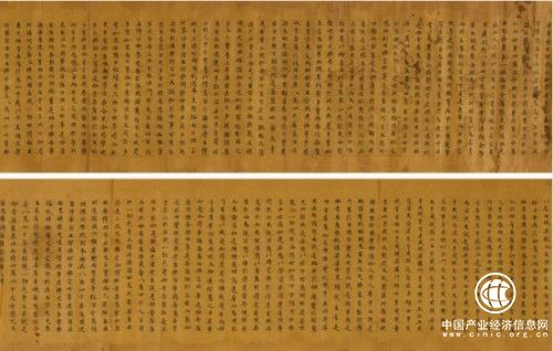 共21纸,共465行。此卷首脱尾全,有乌丝栏,全卷为原纸染潢,黄卷璀璨,楮墨精良。唐代重书学,特别在初唐、中唐、盛唐,写经的书法水平一般非常高。此经书法结体工整匀称,行笔遒劲舒展,丰腴秀丽,笔酣墨饱,带原杆,带经名,千年犹新,甚为难得。楷书用笔工整严谨,笔画挺拔端庄,行笔流丽,字体结构稳妥合理,卷首卷尾背面有“唐经上品”四字。著名敦煌写经藏家苏宗仁旧藏,8米余长,万不存一,为极为难得的千年书法墨迹,盛唐法宝,写经珍品。