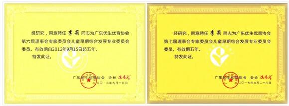 而我们的创始人李莉老师,连续两届获聘为广东优生优育协会儿童早期综合发展专委会委员;
