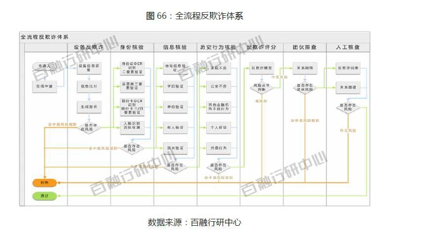 白皮书称,如果将具体的欺诈风险进行归类,可分为四大类:虚假身份、虚假信息、历史欺诈以及团伙欺诈。因此,在通过前端欺诈风险初筛时,针对这四种大风险板块,百融云创可从五个维度进行全方位判别:谛听设备反欺诈(分别从设备环境、应用偏好、行为画像、群体风险以及设备黑名单等方面进行单规则或群体规则的欺诈风险评判)、身份信息验证(主要从身份信息的一致性进行把关)、实名反欺诈(主要从实名信息对应的黑名单、中高风险历史行为记录等进行评估)、百融反欺诈评分(主要从综合的维度评判申请人未来欺诈的可能性)以及评判团伙欺诈的核心产品关系图谱。最后再流入综合信用风险判别。