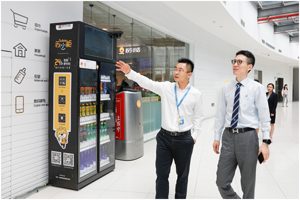 签约仪式后,张曙刚(左)与施建军(右)参观苏宁小店。