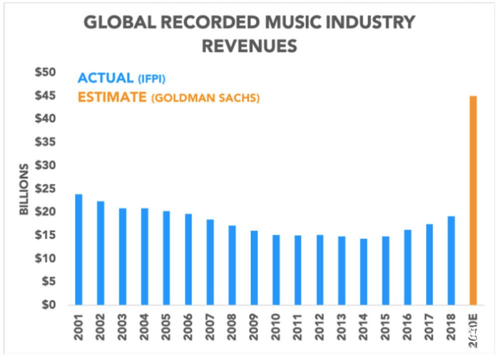 也正得益于这一波消费变革的巨大潜力,全球音乐产业迎来了新的春天。2018 年,全球录制音乐市场增长了9.7%,这是自1997 年IFPI 开始市场数据统计以来连续第四年增长且涨幅最高的一年,而主要动力就来自于付费流媒体32.9%的增幅。国际领先的投行机构高盛乐观预测,全球录制音乐产业的收入将在2030年达到450亿美元。