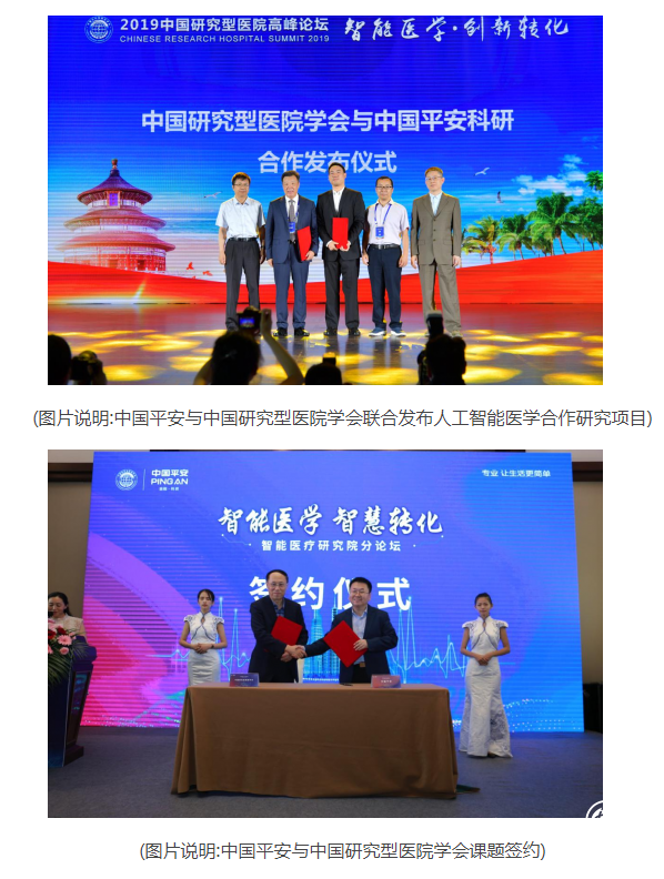 7月20日,中国平安与中国研究型医院学会在“2019中国研究型医院高峰论坛”上联合发布了人工智能医学合作研究项目,同时举办了以“智能医学 智慧转化”为主题的智能医疗研究院分论坛,宣布成立研究院理事会及专家委员会,举行心脑血管病、肿瘤和糖尿病科研合作签约仪式,举办科研创新及智慧医疗转化分享论坛。解放军原总后勤部副部长秦银河,中国研究型医院学会会长何振喜、副会长刘希华、副会长姚军,平安智慧城市联席总经理兼首席战略官高孟轩、平安集团首席医疗科学家谢国彤及有关专家、学者参加了分论坛。在分论坛上,秦银河副部长提出,学会与平安的强强合作,要充分发挥学会的智力优势和社会资源优势,打造“医、诊、疗、防、专、研、用”一体化科研合作,引进双方资源,在行业起到引领和带头作用。