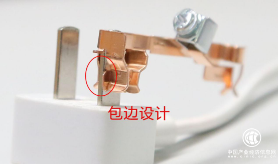 从下面的细节图中可以看到,罗格朗逸景在插座载流件的两孔和三孔位上都有独有的加强筋 ,弯折地方不容易变形,在多次插拔的情况下增加受力能力,从而延长插拔次数和铜片的寿命,减少接触不良的情况 。