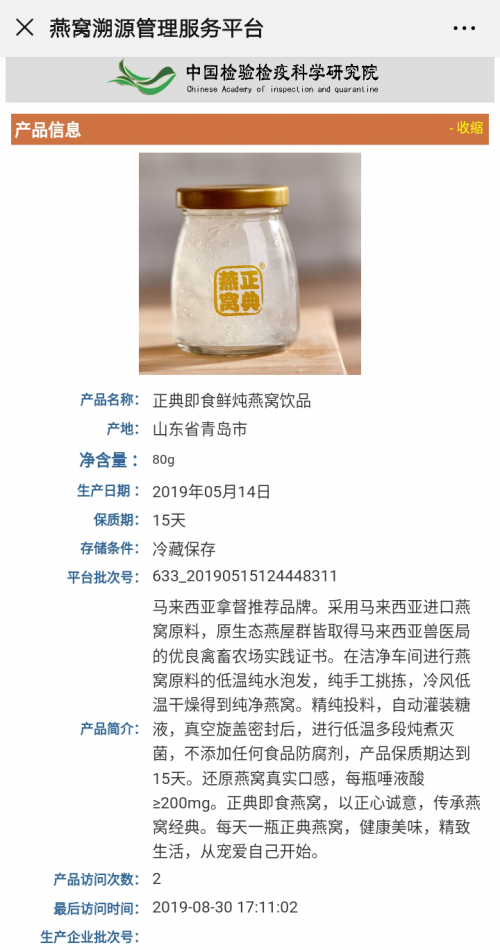 通过CAIQ溯源,实现进口燕窝原料量和即食燕窝产品核算核销,溯源信息准确记录了每一份即食燕窝产品投料量,让消费者吃的明明白白。而不通过CAIQ溯源的即食燕窝,则无法核实其具体投料量。