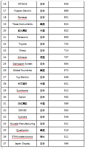入榜中国企业2019年公开的全球半导体技术发明专利申请量/件 数据来源:incoPat