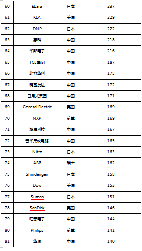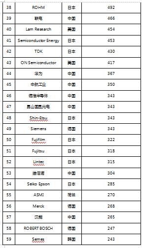 说明:本排行榜专利数据统计2019年1月1日至10月31日,在全球公开的半导体技术发明专利申请数量;本排行榜半导体技术专利数据未包含与发光和光射器件、光刻技术相关的专利。本排行榜出现部分企业的专利件数相同,未做并排合并,是依据检索结果依次排列。以上榜单仅为趋势性参考。
