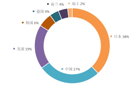 入榜前100名企业主要来自7个国家和地区:日本占比38%,其次中国占比27%、美国占比19%、韩国占比6%,德国和荷兰均占比4%,瑞士占比2%。