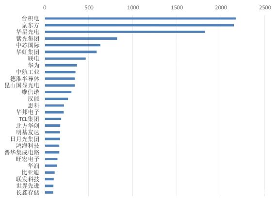 来自中国的27家企业,其中前5家企业专利量均在600件以上,分别是:台积电(2168)、京东方(2147)、华星光电(1821)、紫光集团(822)和中芯国际(631)。