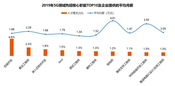 薪资方面,猎聘大数据显示,2019年1月-11月,5G领域中高端人才的平均月薪为2.19万元。