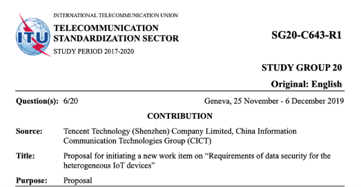 在12月6日结束的国际电信联盟(简称“ITU”) 智慧城市与物联网研究组(简称“SG20”)全体会议上,腾讯牵头提出的国际标准“物联网异构设备的数据安全要求”通过多轮审议,最终立项成功。