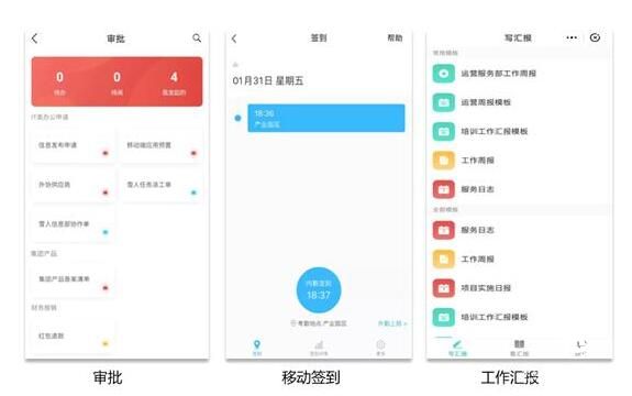 3. 远程办公协作 :移动审批、移动考勤、在线公告、工作汇报、项目任务管理、日程等