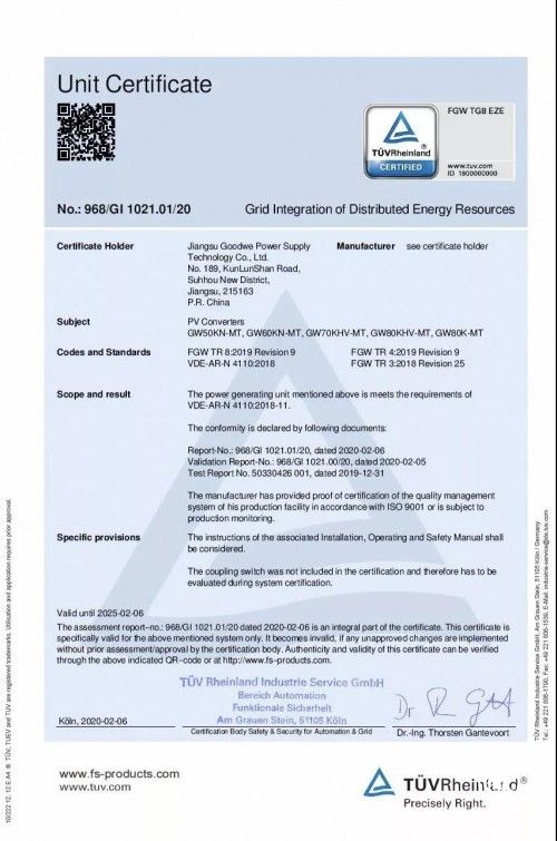 近日,德国莱茵TÜV集团(以下简称“TÜV莱茵”)向江苏固德威电源科技股份有限公司(以下简称“固德威”)MT系列智能光伏逆变器颁发TÜV莱茵首张中压并网VDE-AR-N 4110证书。
