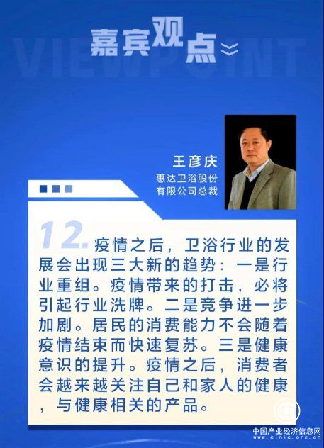 王彦庆认为,疫情之后,卫浴行业的发展会出现三大新的趋势:一是行业重组。疫情带来的打击,必将引起行业洗牌。疫情之后,一些行业优势企业在保证自身资金流的前提下,强化核心竞争力,对一些优质资源进行整合,为头部企业做大做强创造了机会。二是竞争进一步加剧。居民的消费能力不会随着疫情结束而快速复苏,对企业来说,只有不断开发新产品,提升产品质量和服务,进一步降低成本,才能在激烈的竞争中获得生存和发展的机会。三是健康意识的提升。疫情之后,消费者会越来越关注自己和家人的健康,与健康相关的产品,比如智慧家居、智能马桶、整体卫浴,会迎来新的发展机遇。