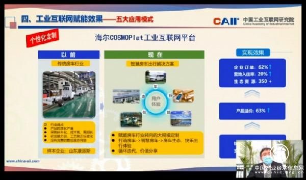 在《工业互联网赋能实体经济转型升级》的主题演讲中,田野从概念内涵、发展态势、赋能效果等维度详细介绍了工业互联网。他重点介绍了卡奥斯COSMOPlat代表的个性化定制、中信云网的网络化协同、树根互联的服务化延伸等五大应用模式。