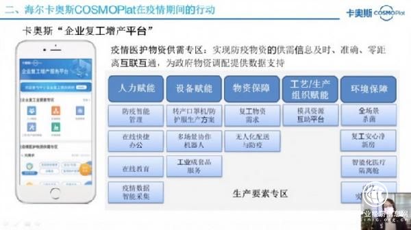 首期培训课程中,两位嘉宾都重点介绍了工业互联网在新冠肺炎疫情防控和企业复工复产过程中发挥的重要作用。严鹏飞从自身在本次疫情期间的实际行动出发,分享了平台基于企业疫情防控管理和复工复产需求,如何全流程赋能企业实现复工增产,以及卡奥斯COSMOPlat“复工增产服务平台”的应用案例。