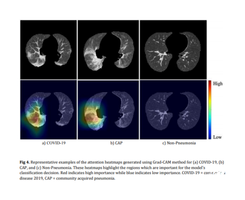 为了提高模型的可解释性,科亚医疗的研究团队基于加权梯度类激活映射方法,来可视化导致深度学习模型COVNet做出决策的重要区域(由模型自动生成)。图2展示了新冠肺炎、社区获得性肺炎、及非肺炎病例CT的可疑区域热图。这些热图表明,COVNet最为关注异常区域,同时正确地忽略正常区域,以帮助算法框架识别出病灶区域并做出准确的疾病鉴别。