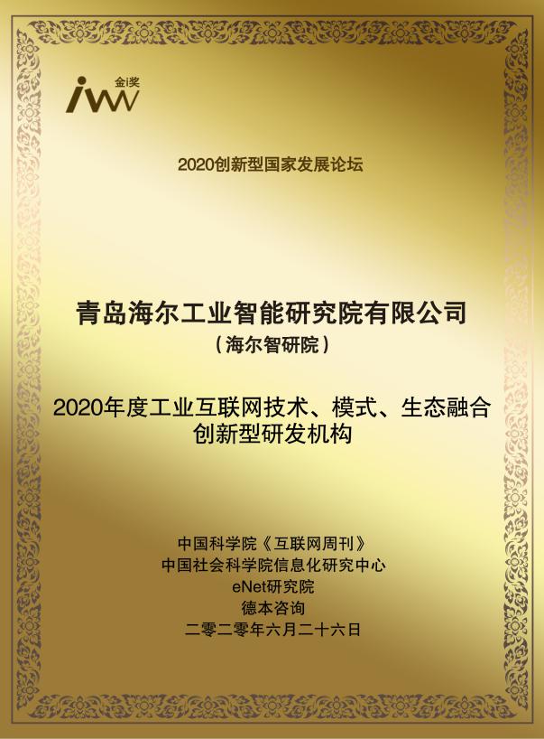 6月26日,由中国科学院《互联网周刊》、中国社会科学院信息化研究中心、eNet研究院等单位主办的“2020创新型国家发展论坛”在线上举办。在论坛分批公布的2020创新类金i奖名单中,海尔工业智能研究院获评“2020年工业互联网技术、模式、生态融合创新型研发机构”。同时,这也是继2019年度获评优秀智能制造企业之后,时隔半年后再次获得行业创新大奖。