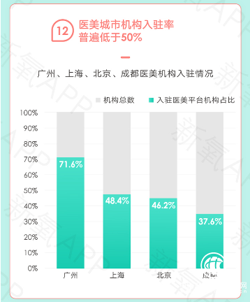 新氧选取中国医美发展最成熟的4个城市开展调研,发现:广州合规医美机构250多家,入驻医美平台机构数179家,入驻率高达71.6%;上海合规医美机构310家,入驻医美平台机构数约150家,入驻率达48.4%;北京合规医美机构600余家,入驻医美平台机构数277家,入驻率达46.2%;成都合规机构450家,入驻医美平台机构数169家,入驻率仅37.6%。由此可见,一二线城市医美机构线上入驻率普遍低于50%,这也拉低了消费者的在线求美体验。
