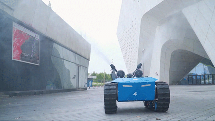 在南京、杭州等地,可以看到一辆蓝色无人装甲车穿梭小区里、楼宇间,只见它爬坡过坎,转弯调头无处不达,两根360度全向喷淋管灵活转动进行消杀作业。