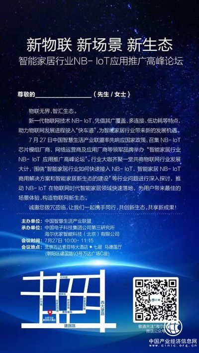 2017年7月27日,北京,“新物联、新场景、新生态——智能家居行业NB-IoT应用推广高峰论坛”上,海尔U+将有何等惊世之举?峰会能否成为NB-IoT的战略转折点?且看智慧家庭如何布局NB-IoT,期待共同见证海尔U+和中国智慧生活产业联盟共同引爆NB-IoT产业新的蓝海市场!