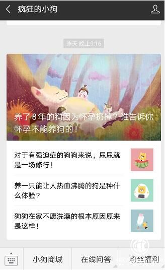 据了解,疯狂小狗以天猫、京东等综合电商平台为主要阵地,借助公众号、订阅号、小程序、APP、CRM系统,构建疯狂小狗线上用户矩阵,实现与用户的亲密、频繁的互动,在增强品牌黏性的同时,也从根本上了解用户需求,进而在用户反馈基础上,对销售、产品等进行调整,从而为消费者打造贴心、愉快的购物体验。以疯狂小狗微信公众号为例,其面向C端养狗人群,内容以情感生活和科普知识为主,频频与用户互动,看点多多,成为品牌吸睛的一大利器。